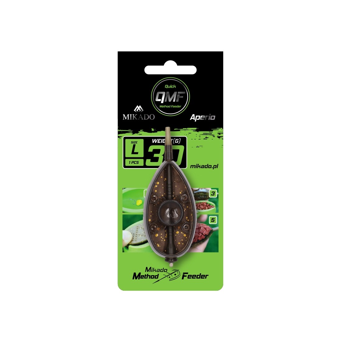 Ewolucja świetnych koszyków Method Feeder Aperio. Q.M.F. to system pozwalający w szybki i łatwy sposób wymienić podajnik bez konieczności rozbrajania całego zestawu. Wystaczy zdjąć gumową tulejkę, zsunąć koszyk z trzpienia i zamienić go innym modelem.
